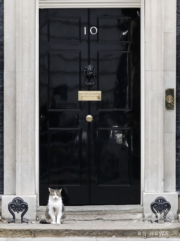 子犬は救助犬として知られるジャックラッセルテリアの雄で、英動物愛護団体「フレンズ・オブ・アニマルズ・ウェールズ(Friends of Animals Wales)」が保護していた。だが、首相官邸には長年、猫のラリー(Larry)が住んでおり、この日も官邸の玄関前に姿を見せた。(c)AFP