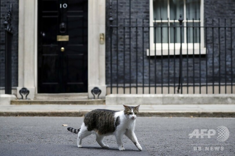 子犬は救助犬として知られるジャックラッセルテリアの雄で、英動物愛護団体「フレンズ・オブ・アニマルズ・ウェールズ(Friends of Animals Wales)」が保護していた。だが、首相官邸には長年、猫のラリー(Larry)が住んでおり、この日も官邸の玄関前に姿を見せた。(c)AFP