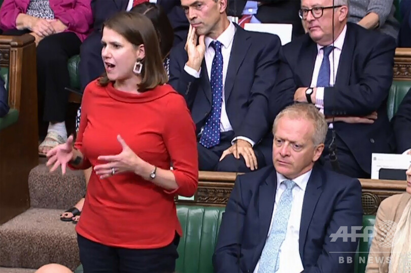 リー議員はジョンソン氏の発言中、下院の議場を移動し、親欧州派の自由民主党の席に座った。同議員は離党届の中で、保守党がブレグジットにより「ポピュリズムとイングランドのナショナリズムという2つの病気に感染した」と批判した。(c)AFP/ Alice RITCHIE and Dmitry ZAKS