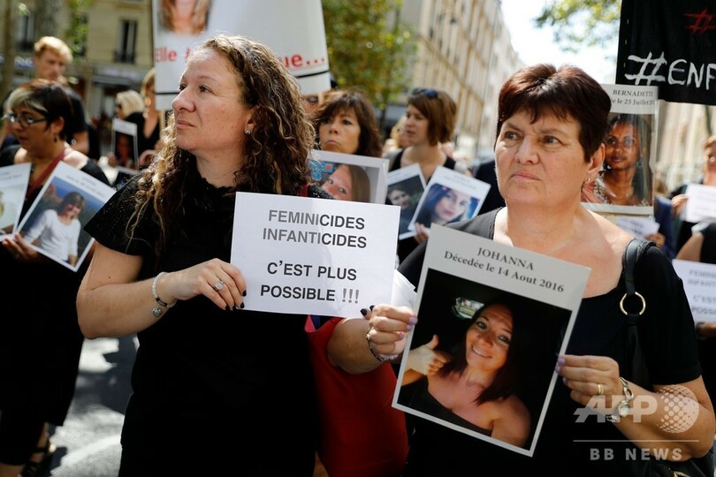 フランスでは、現在のパートナーや元パートナーらに殺害される女性が多く、世論の怒りが高まっている。2017年の欧州連合(EU)の統計によると、フランスは欧州諸国の中でドイツに次いで2番目にDVによる女性の殺人件数が多いという。去年だけでも121人の女性がDV関連で殺害されており、3日に1人が犠牲になっている。また今年現時点でのDV殺人の被害者はすでに少なくとも100人以上に上っている。(c)AFP