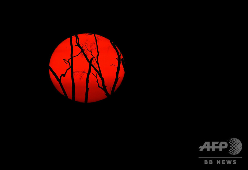 【9月11日 AFP】アマゾン(Amazon)熱帯雨林の森林火災で焼けた木々の背後に沈む夕日。ブラジル・ポルトベーリョ(Porto Velho)南部で。