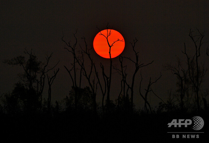 【9月11日 AFP】アマゾン(Amazon)熱帯雨林の森林火災で焼けた木々の背後に沈む夕日。ブラジル・ポルトベーリョ(Porto Velho)南部で。