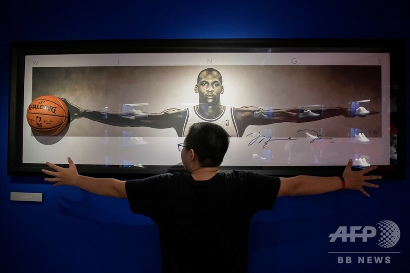 【9月8日 AFP】中国・北京で米プロバスケットボール(NBA)の展示会が催され、往年の名選手マイケル・ジョーダン(Michael Jordan)氏の写真の前で、腕を広げる来場者。同国で開催されているFIBAバスケットボール・ワールドカップ(FIBA Basketball World Cup 2019)は9月15日まで。(c)AFP