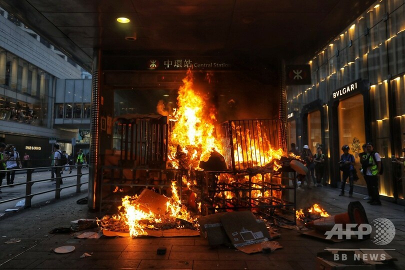 香港では日中の抗議行動が平和的に終わった後、夜間に機動隊がデモ隊の強硬派を実力で排除するパターンが日常化している。強硬派の活動家らは、道路の封鎖や地下鉄駅構内での破壊活動のほか、バリケードを作って火を付けるなどの行為をしている。(c)AFP/Jerome TAYLOR / Yan ZHAO