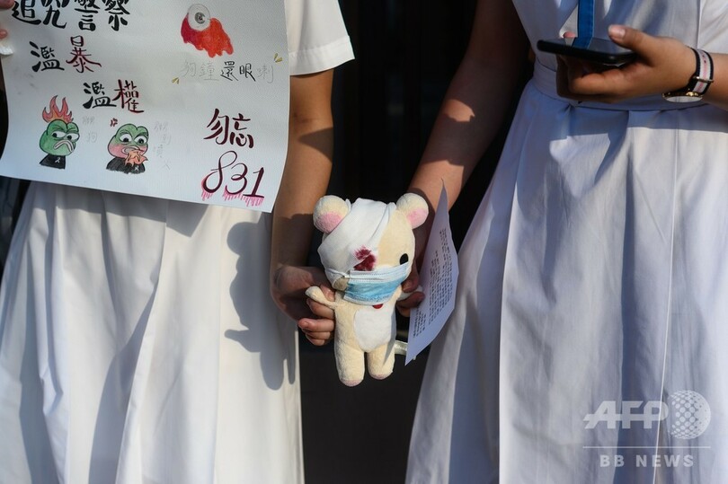 【9月9日 AFP】香港で9日早朝、複数の学校の生徒や卒業生、教師らが手をつないで「人間の鎖」をつくり、香港政府に5つの要求を受け入れるよう訴える抗議デモを行った。
