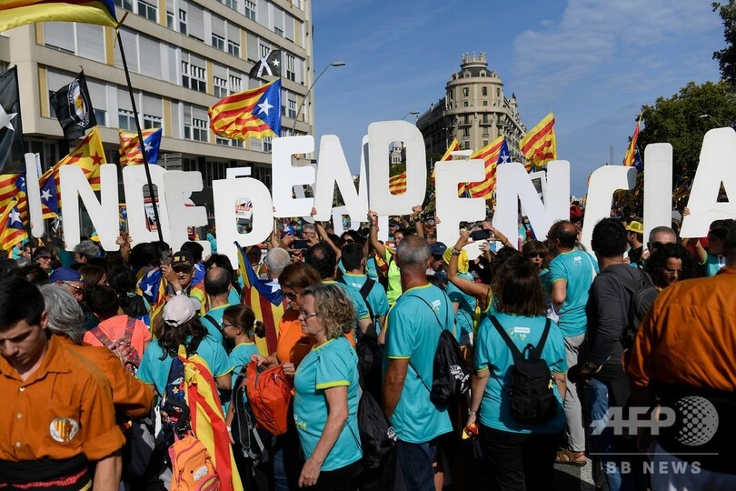 【9月12日 AFP】スペイン北東部カタルーニャ(Catalonia)自治州の祝日に当たる11日、州都バルセロナ(Barcelona)でスペインからの分離独立を求める恒例のデモが行われ、警察発表によると約60万人が参加した。デモはカタルーニャ独立派の影響力を試す試金石とされているが、独立派が分裂する中、参加者数は昨年の約100万人から大幅に減り、2012年のデモ開始以来最低となった。