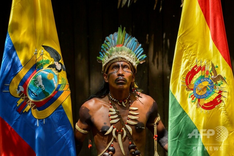 【9月19日 AFP】コロンビア東南部レティシア(Leticia)で開催されるアマゾン首脳会議(Presidential Summit for the Amazon)を控え、先祖伝来の共同家屋「マロカ(maloca)」の中でポーズを取る同国先住民ウイトト(Huitoto)の男性。