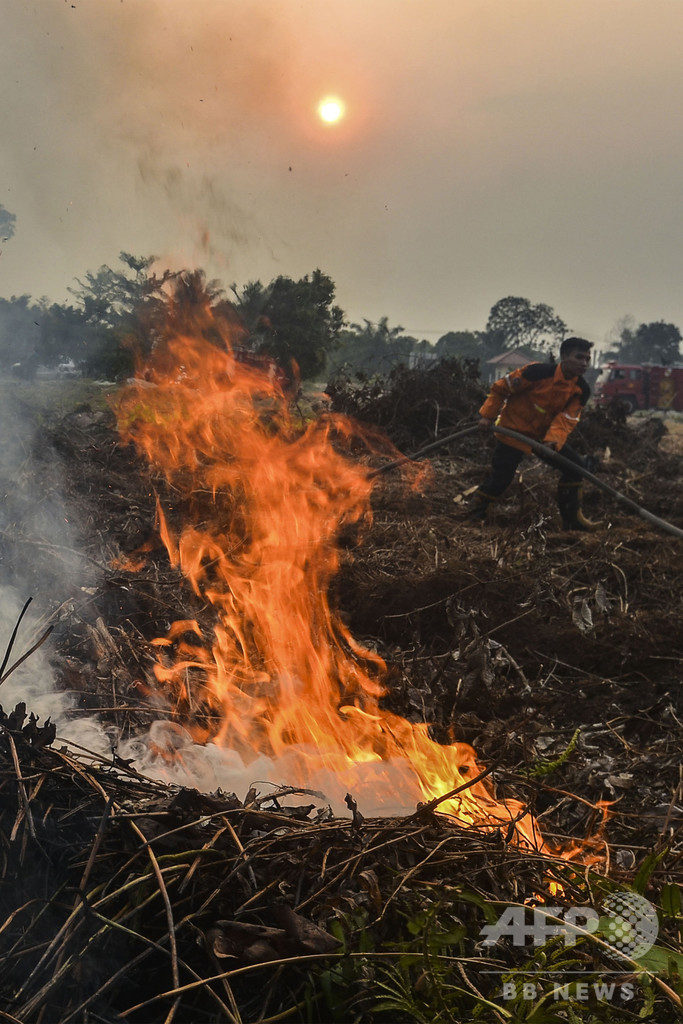 AFP記者らによると、被害の大きいスマトラ島のリアウ(Riau)州では、消防士らが24時間態勢で活動を続け、焼け焦げた木々の間で濃い白煙を上げる炎を消し止めた。