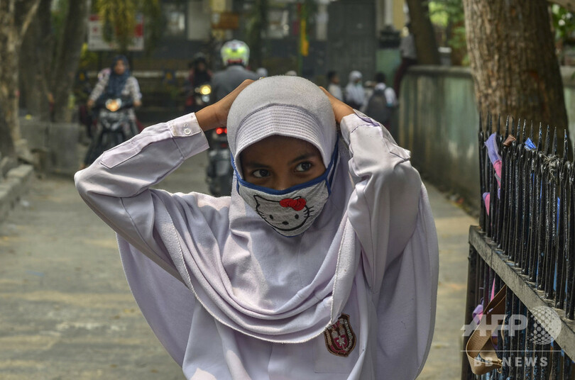 州都プカンバル(Pekanbaru)は濃い煙に覆われ、日中にもかかわらず空が暗くなった。住民の多くは、簡単なマスクを着けるだけで普段通りの生活を送ろうとした。(c)AFP/Dessy Sagita