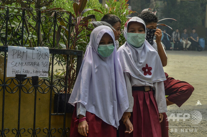 州都プカンバル(Pekanbaru)は濃い煙に覆われ、日中にもかかわらず空が暗くなった。住民の多くは、簡単なマスクを着けるだけで普段通りの生活を送ろうとした。(c)AFP/Dessy Sagita