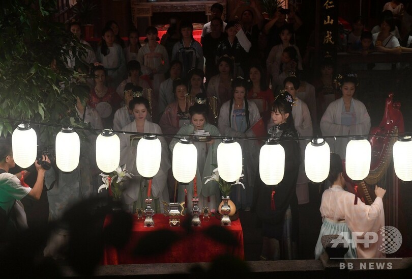 【9月13日 CNS】中国・福建省(Fujian)福州市(Fuzhou)の福建民俗博物館(Fujian Folk Museum)で12日夜、中国伝統の中秋節(Mid-Autumn Festival)前夜を迎え、十数人の古式な「漢服」を身にまとった少女らが伝統の「中秋拜月」イベントを執り行い、多くの市民が参加した。(c)CNS/JCM/AFPBB News