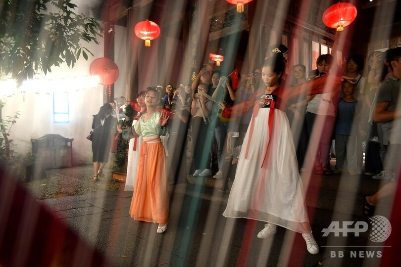 【9月13日 CNS】中国・福建省(Fujian)福州市(Fuzhou)の福建民俗博物館(Fujian Folk Museum)で12日夜、中国伝統の中秋節(Mid-Autumn Festival)前夜を迎え、十数人の古式な「漢服」を身にまとった少女らが伝統の「中秋拜月」イベントを執り行い、多くの市民が参加した。(c)CNS/JCM/AFPBB News