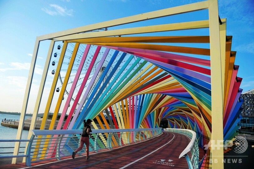 【9月15日 CNS】中国・山東省(Shandong)青島市(Qingdao)西海岸新区にある唐島湾(Tangdaowan)海浜公園の観光名所「彩虹橋(レインボーブリッジ)」。市民や観光客が、朝日を浴びながらジョギングやサイクリングをしていた。(c)CNS/JCM/AFPBB News