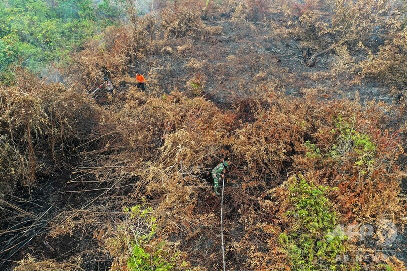 【9月15日 AFP】熱帯雨林を焼き払い、東南アジアの広範囲に有害なスモッグをもたらす森林火災が続くインドネシアでは、大勢の消防隊員らが24時間態勢で消火活動に当たっている。しかし、装備が不足しており、薄っぺらいマスクとゴム長靴しか身に着けていない隊員もいる。