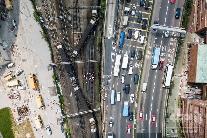 【9月17日 AFP】(写真追加)香港中心部で17日、朝のラッシュの時間帯に通勤列車が脱線し、8人が負傷した。