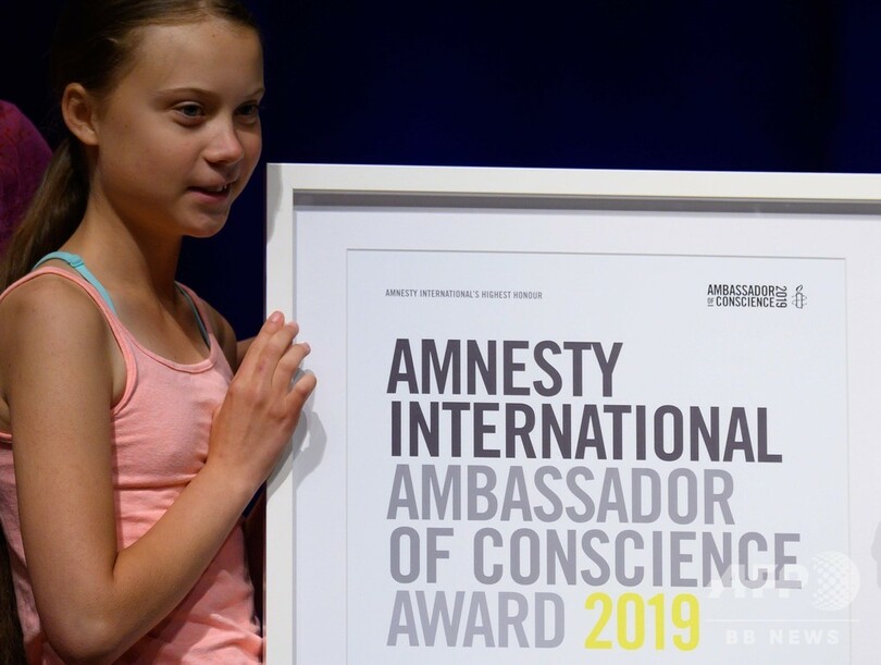 トゥンベリさんは16日、気候変動対策の必要性を訴える姿勢を評価され、国際人権団体アムネスティ・インターナショナル(Amnesty International)から「良心の大使賞(Ambassadors of Conscience Award)」を授与された。また、20日にはニューヨークで行われる「グローバル気候マーチ(Global Climate Strike)」に参加する予定。(c)AFP/Issam AHMED