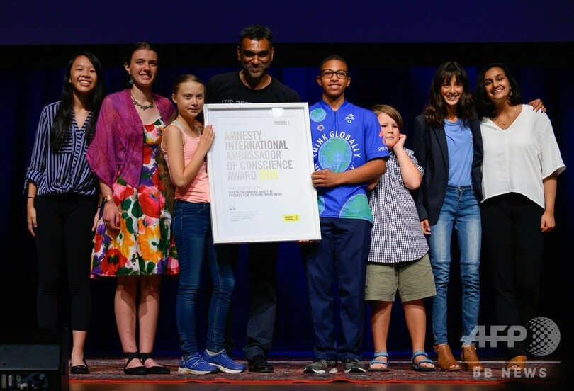 トゥンベリさんは16日、気候変動対策の必要性を訴える姿勢を評価され、国際人権団体アムネスティ・インターナショナル(Amnesty International)から「良心の大使賞(Ambassadors of Conscience Award)」を授与された。また、20日にはニューヨークで行われる「グローバル気候マーチ(Global Climate Strike)」に参加する予定。(c)AFP/Issam AHMED