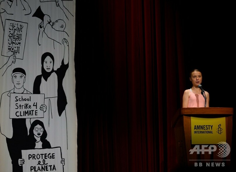トゥンベリさんは16日、気候変動対策の必要性を訴える姿勢を評価され、国際人権団体アムネスティ・インターナショナル(Amnesty International)から「良心の大使賞(Ambassadors of Conscience Award)」を授与された。また、20日にはニューヨークで行われる「グローバル気候マーチ(Global Climate Strike)」に参加する予定。(c)AFP/Issam AHMED