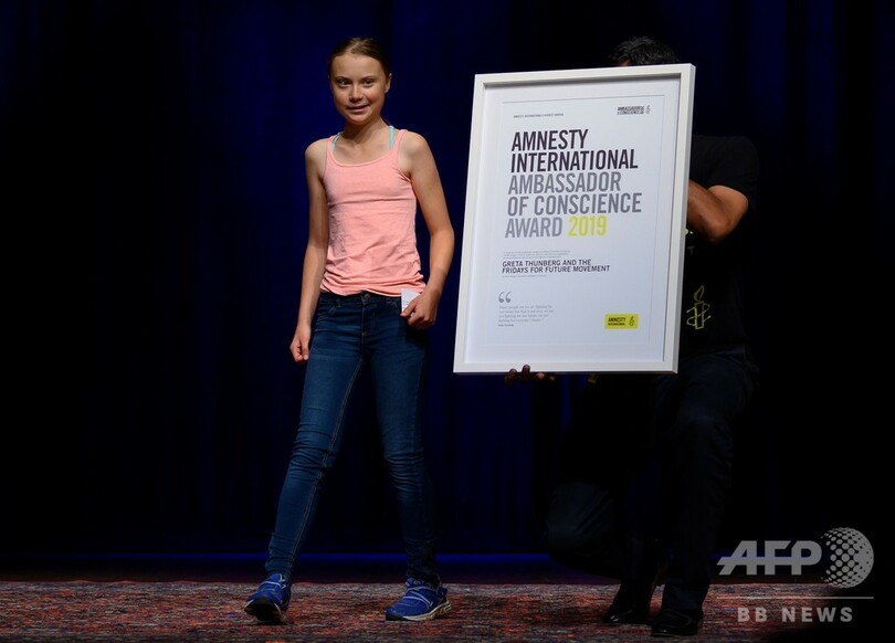 トゥンベリさんは16日、気候変動対策の必要性を訴える姿勢を評価され、国際人権団体アムネスティ・インターナショナル(Amnesty International)から「良心の大使賞(Ambassadors of Conscience Award)」を授与された。また、20日にはニューヨークで行われる「グローバル気候マーチ(Global Climate Strike)」に参加する予定。(c)AFP/Issam AHMED