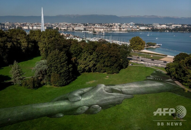 難民支援に「手をつなぐ」巨大アート登場 スイス