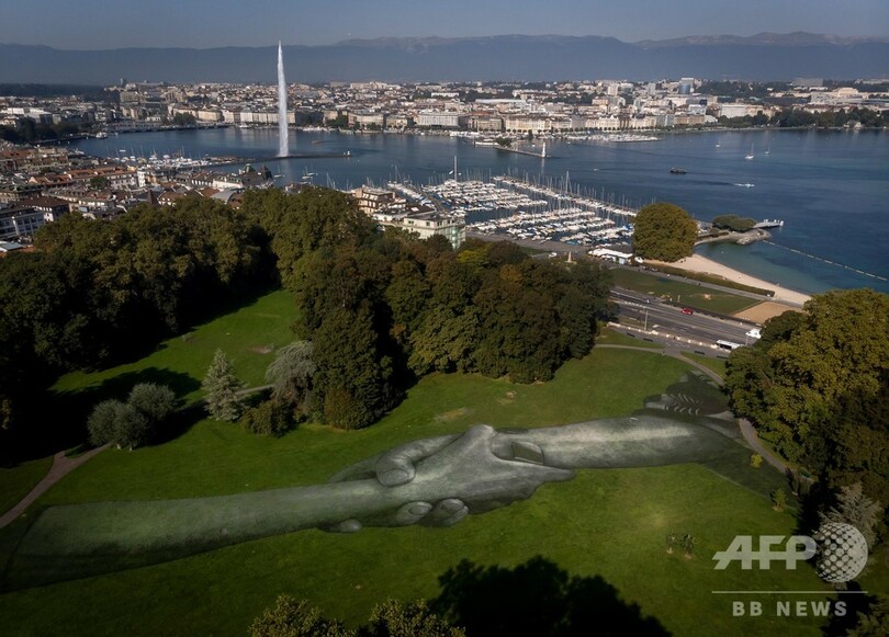 【9月18日 AFP】スイス西部ジュネーブのグランジュ公園(Parc de la Grange)に、フランス人アーティストのサイープ(Saype)氏が手掛けた巨大アート「ビヨンド・ウオールズ(Beyond Walls、壁を越えての意)」が登場した。地中海で移民・難民の救助などに取り組むフランスのNGO「SOSメディテラネ(SOS Mediterranee)」の活動を支援するために制作された。(c)AFP