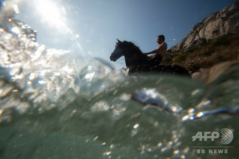 【9月23日 AFP】フランス・マルセイユ(Marseille)の入り江「カランク・ド・ソルミウ(Calanque of Sormiou)」で、馬のインドラ(Indra)に泳ぎの訓練をするアーティストのマノロ(Manolo)さん。(c)AFP