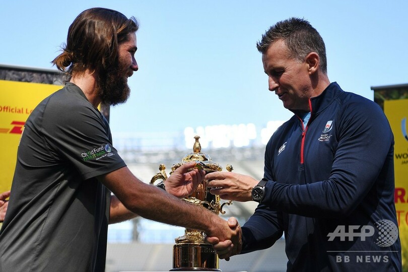 大のラグビー好きの二人組が、英トゥイッケナム(Twickenham)から東京まで27か国を通る総行程2万キロメートル以上の旅を経て会場へ届けた。