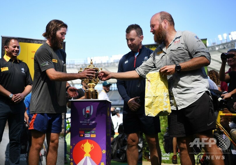 大のラグビー好きの二人組が、英トゥイッケナム(Twickenham)から東京まで27か国を通る総行程2万キロメートル以上の旅を経て会場へ届けた。