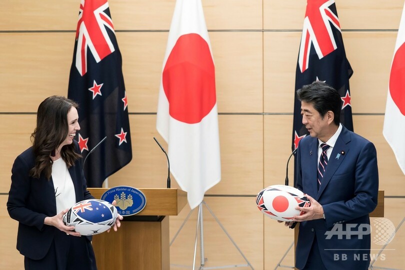 【9月20日 AFP】安倍晋三(Shinzo Abe)首相は19日、訪日中のニュージーランドのジャシンダ・アーダーン(Jacinda Ardern)首相と首相官邸で会談した。20日のラグビーW杯日本大会(Rugby World Cup 2019)開幕を前に、両首脳はラグビーボールを交換した。(c)AFP