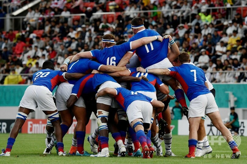 一方、出場国の中では最も低い世界ランキング23位のナミビアも、最後まで気持ちの入ったプレーを見せた。ナミビアのディフェンスコーチは、もし自分たちが金星を飾るようなことがあればファンの前で即興のハカを披露すると約束しており、実際に絶好のスタートを切ったものの、最終的には地力の差が出た。(c)AFP