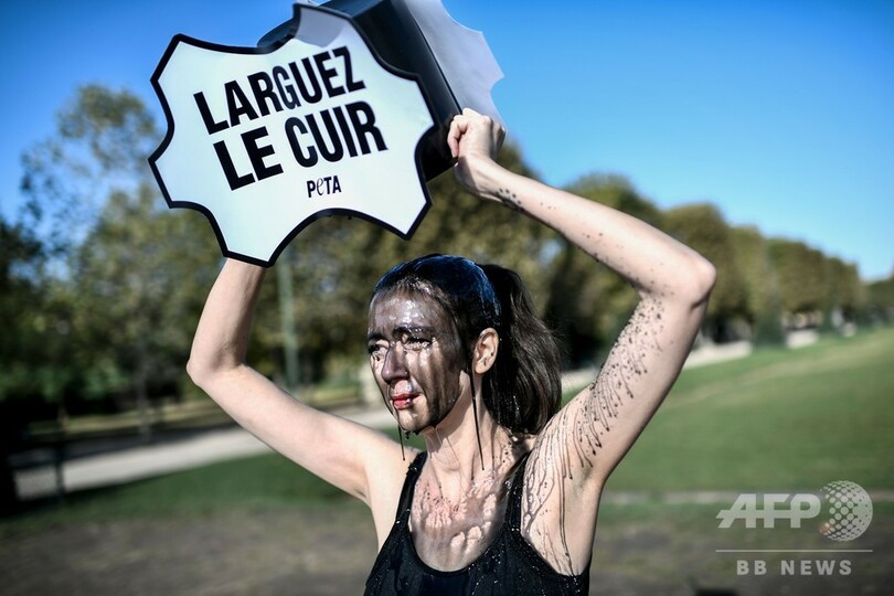 【9月24日 AFP】フランス首都パリのエッフェル塔(Eiffel Tower)前で23日、動物愛護団体「動物の倫理的扱いを求める人々の会(PETA)」の活動家らが黒い液体を自ら浴び、ファッション業界での皮革の使用に抗議した。