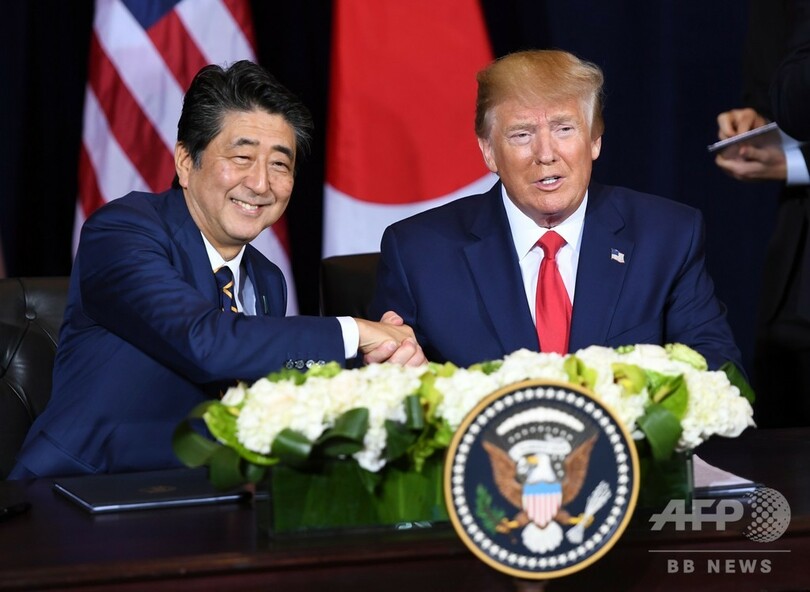 両首脳は、米ニューヨークで開かれた国連総会(UN General Assembly)に合わせ会談。安倍首相は、協定は「日米双方にとってウィン・ウィン(相互利益)」の内容だと語った。