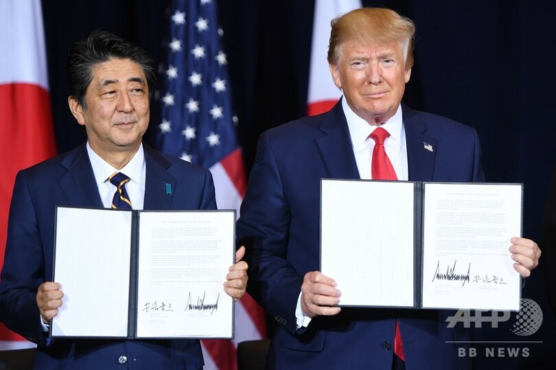 両首脳は、米ニューヨークで開かれた国連総会(UN General Assembly)に合わせ会談。安倍首相は、協定は「日米双方にとってウィン・ウィン(相互利益)」の内容だと語った。