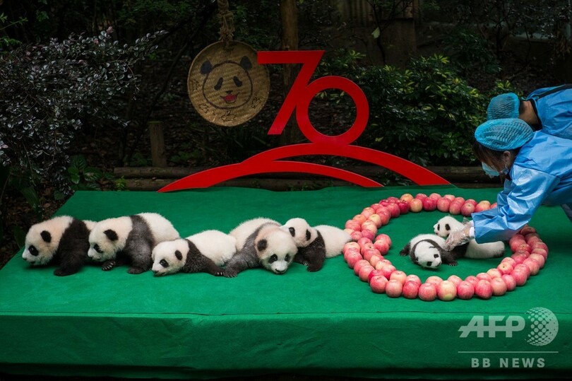 【9月26日 AFP】中国・四川(Sichuan)省にある成都ジャイアントパンダ繁殖研究基地(Chengdu Research Base of Giant Panda Breeding)で24日、今年生まれたパンダの赤ちゃんたちが中国建国70周年記念イベントに合わせ公開された。パンダの赤ちゃんたちは飼育員の手を借りて「7」の形に並び、リンゴで作った数字の「0」と合わせて「70」を描いた。(c)AFP
