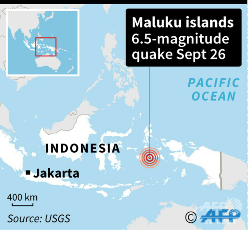 【9月26日 AFP】(更新)インドネシア東部のマルク諸島(Maluku Islands)で26日午前8時46分(日本時間同)、マグニチュード(M)6.5の強い地震が発生し、少なくとも20人が死亡した。