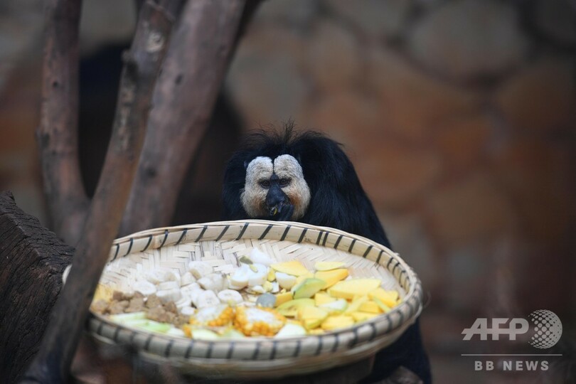 リンゴやマンゴー、トウモロコシなどで作った雲南風の「手づかみ飯」を飼育員が準備し、白い顔の客人「シロガオサキ」にごちそうした。(c)CNS/JCM/AFPBB News