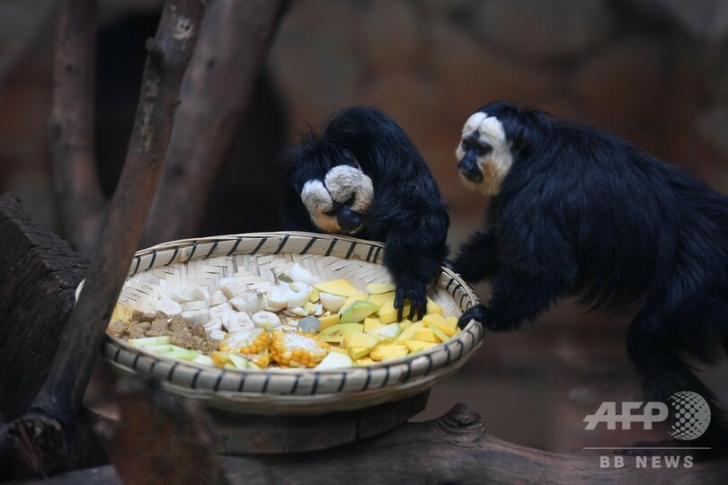 リンゴやマンゴー、トウモロコシなどで作った雲南風の「手づかみ飯」を飼育員が準備し、白い顔の客人「シロガオサキ」にごちそうした。(c)CNS/JCM/AFPBB News