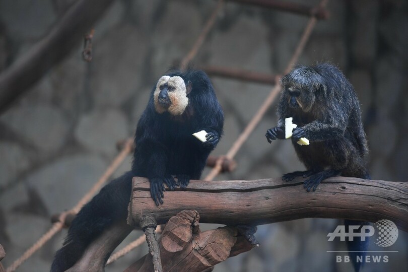南米から来た、白いお面をつけたような顔をしたサルの一種「シロガオサキ」が来場者の前に姿を現した。