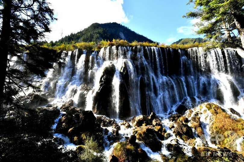 九寨溝の景勝地の85%の区域は基本的に受け入れ条件が整い、今回開放されるエリアには、見どころとして、元からあった「諾日朗(Nuorilang)瀑布(ばくふ)」に、新しく「双龍海(Shuanglonghai)瀑布」が加わっている。(c)CNS/JCM/AFPBB News
