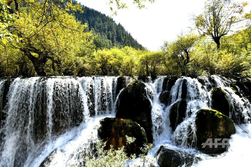 九寨溝の景勝地の85%の区域は基本的に受け入れ条件が整い、今回開放されるエリアには、見どころとして、元からあった「諾日朗(Nuorilang)瀑布(ばくふ)」に、新しく「双龍海(Shuanglonghai)瀑布」が加わっている。(c)CNS/JCM/AFPBB News