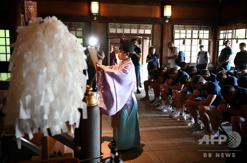 【9月27日 AFP】ラグビーW杯日本大会(Rugby World Cup 2019)に出場しているフランス代表は26日、熊本市内を訪れ、能を舞ったり、地元住民と言葉を交わしたりして文化交流した。また、おはらいを受けた出水神社(Izumi Shrine)では、熊本県の人気キャラクター「くまモン(Kumamon)」からの歓迎を受けた。(c)AFP