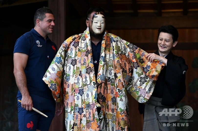 【9月27日 AFP】ラグビーW杯日本大会(Rugby World Cup 2019)に出場しているフランス代表は26日、熊本市内を訪れ、能を舞ったり、地元住民と言葉を交わしたりして文化交流した。また、おはらいを受けた出水神社(Izumi Shrine)では、熊本県の人気キャラクター「くまモン(Kumamon)」からの歓迎を受けた。(c)AFP