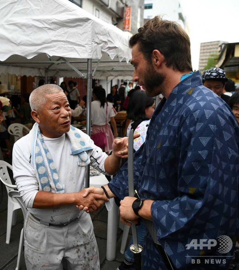 【9月27日 AFP】ラグビーW杯日本大会(Rugby World Cup 2019)に出場しているフランス代表は26日、熊本市内を訪れ、能を舞ったり、地元住民と言葉を交わしたりして文化交流した。また、おはらいを受けた出水神社(Izumi Shrine)では、熊本県の人気キャラクター「くまモン(Kumamon)」からの歓迎を受けた。(c)AFP