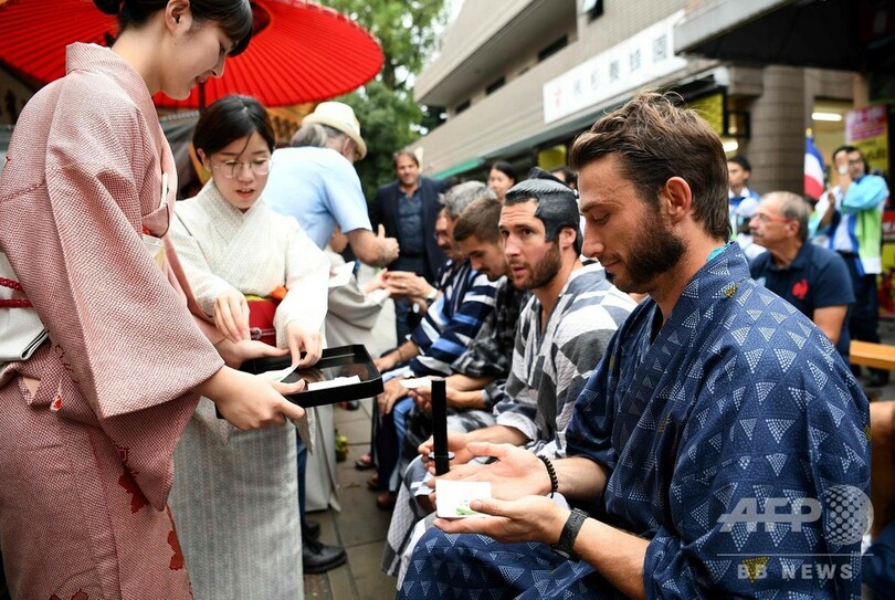 【9月27日 AFP】ラグビーW杯日本大会(Rugby World Cup 2019)に出場しているフランス代表は26日、熊本市内を訪れ、能を舞ったり、地元住民と言葉を交わしたりして文化交流した。また、おはらいを受けた出水神社(Izumi Shrine)では、熊本県の人気キャラクター「くまモン(Kumamon)」からの歓迎を受けた。(c)AFP