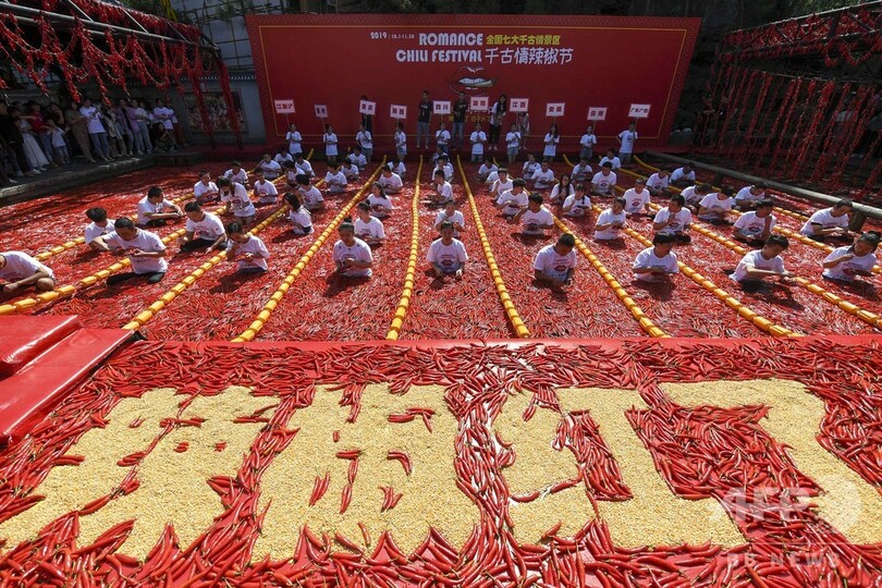 農産物の収穫を祝うイベントで、5トンのトウガラシが入った約300平方メートルの巨大プールの中に入り、1分間で何本を食べられるかを競い合った。
