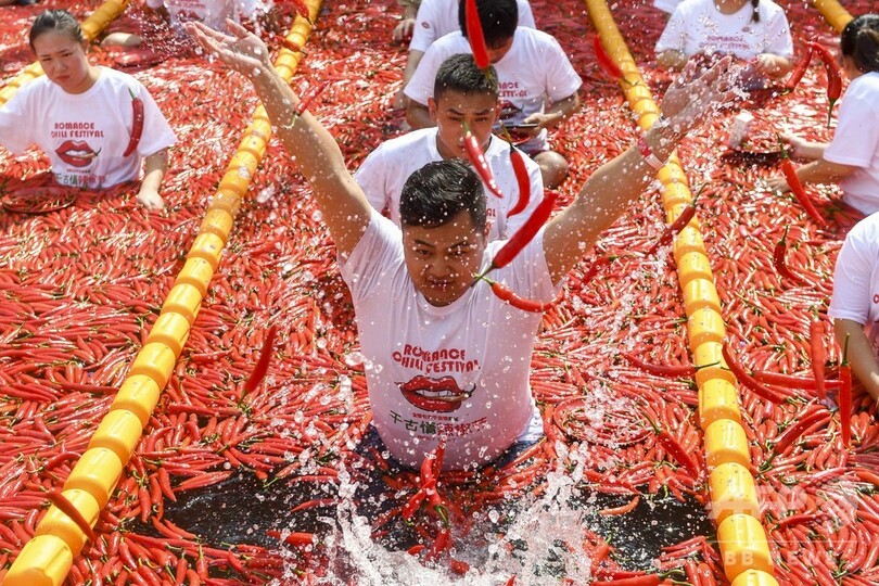 農産物の収穫を祝うイベントで、5トンのトウガラシが入った約300平方メートルの巨大プールの中に入り、1分間で何本を食べられるかを競い合った。