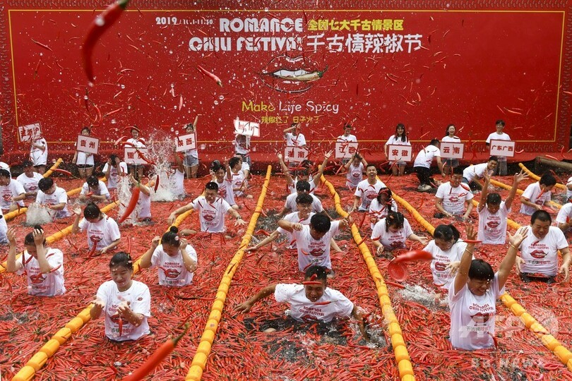 【9月28日 CNS】中国・浙江省(Zhejiang)杭州市(Hangzhou)のテーマパーク「宋城(Songcheng)景区」で22日、トウガラシでいっぱいとなったプールの中でトウガラシを食べるコンテストが行われ、全国各地から大勢の挑戦者が集まった。