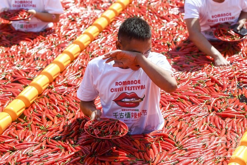 農産物の収穫を祝うイベントで、5トンのトウガラシが入った約300平方メートルの巨大プールの中に入り、1分間で何本を食べられるかを競い合った。