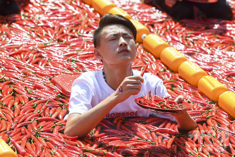 農産物の収穫を祝うイベントで、5トンのトウガラシが入った約300平方メートルの巨大プールの中に入り、1分間で何本を食べられるかを競い合った。