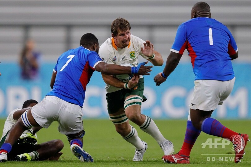 【9月28日 AFP】ラグビーW杯日本大会(Rugby World Cup 2019)は28日、プールBの試合が行われ、南アフリカがナミビアを57-3で下した。2度のW杯優勝を誇る南アフリカは、ナミビアを圧倒して大差の勝利を収め、準々決勝進出に一歩前進した。